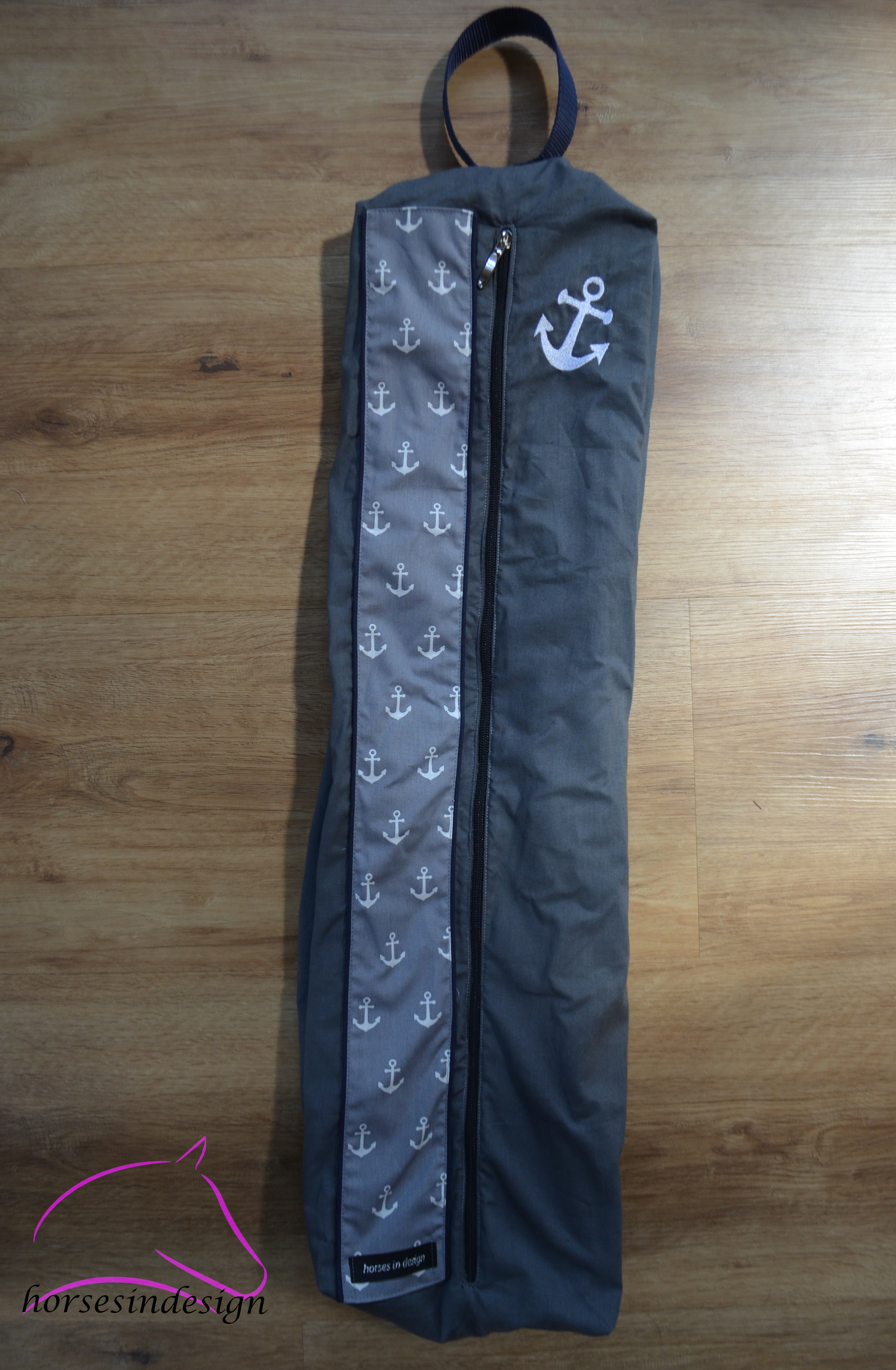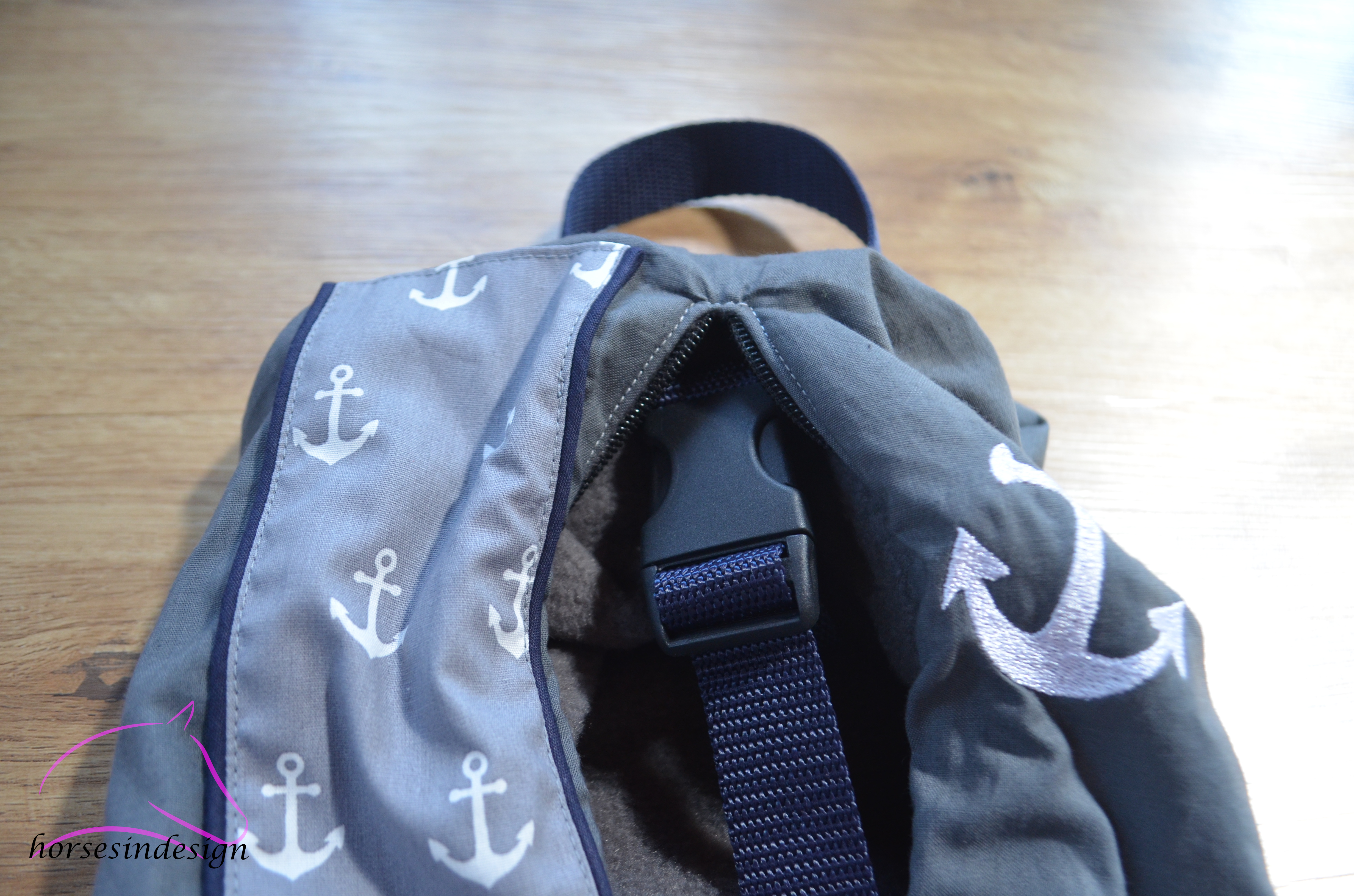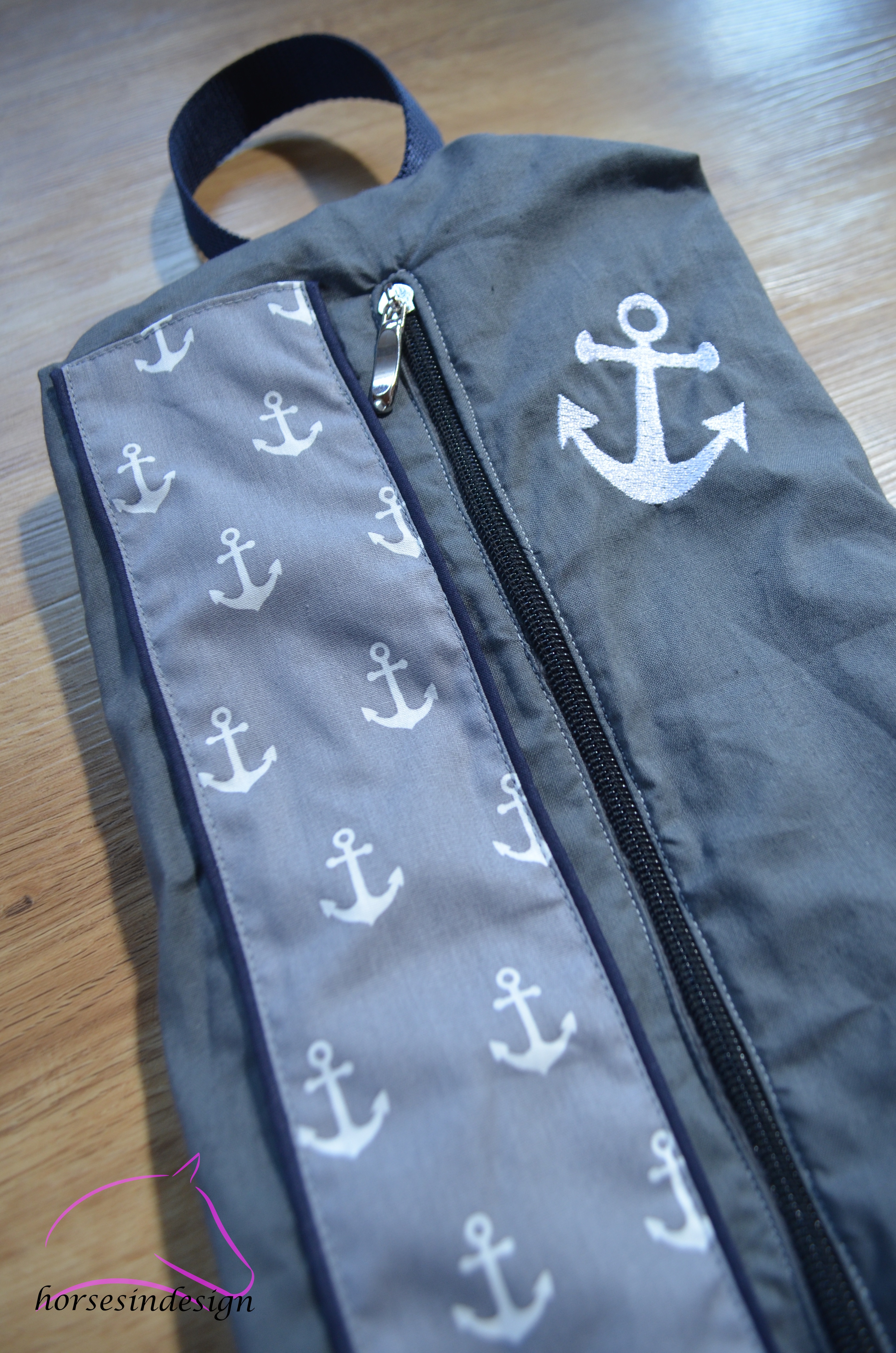 Diese Tasche hat einen Ankerstoff und ist mit einer dunkelblauen Paspel abgesetzt. Außerdem hat sie eine schöne Anker-Bestickung.